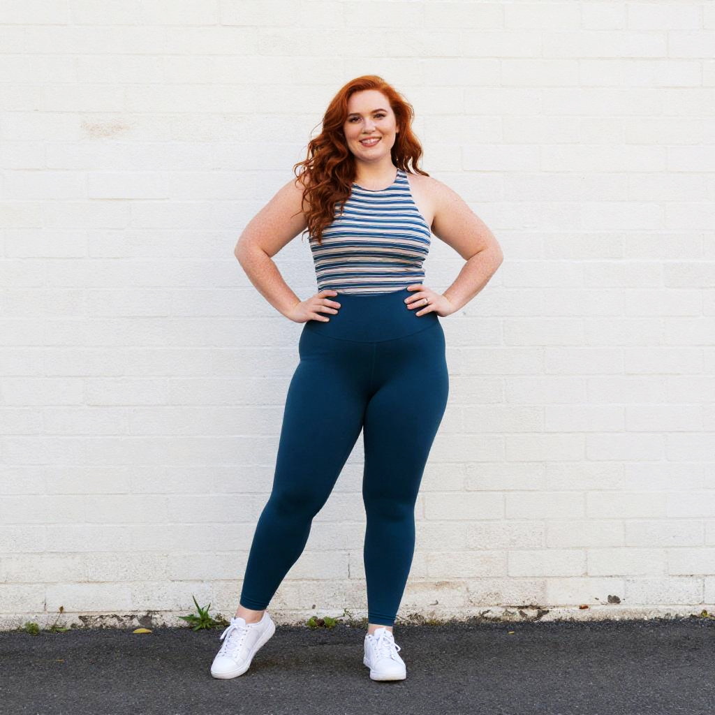 A confident red-haired woman poses in front of a white brick wall, showcasing a sporty casual look with a sleeveless striped top and teal leggings. Her hands rest on her hips, and she smiles warmly, embodying a modern, healthy lifestyle.