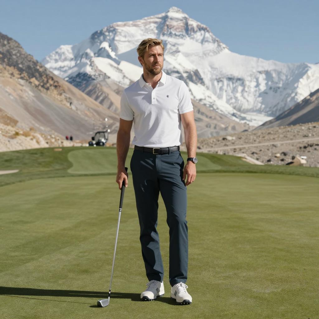 A professional-looking man stands on a pristine golf course with a putter in hand, poised and focused. Behind him, majestic snow-capped mountains create a stunning backdrop, blending the serenity of nature with the precision of sport in this high-end commercial photo.