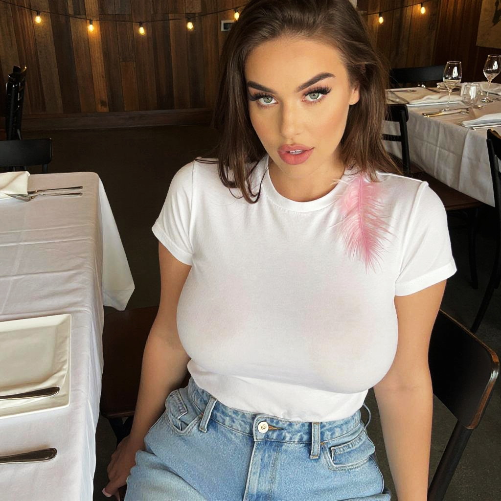 A busty woman poses playfully in a casual outfit, featuring a classic white crew-neck t-shirt paired with high-waisted light blue jeans. She is seated in a warmly lit restaurant setting, with wood-paneled walls and neatly set tables in the background, highlighting a relaxed yet stylish vibe.
