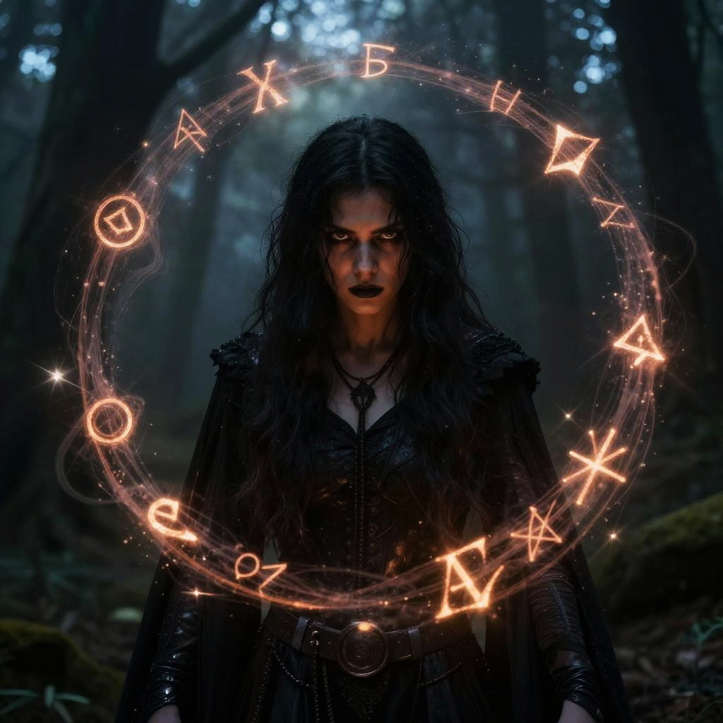 A dark and intense woman stands in a misty forest, surrounded by a glowing circle of mystical runes and symbols. Her gothic attire and piercing gaze evoke a powerful, magical presence as if she is casting a spell or summoning ancient forces.