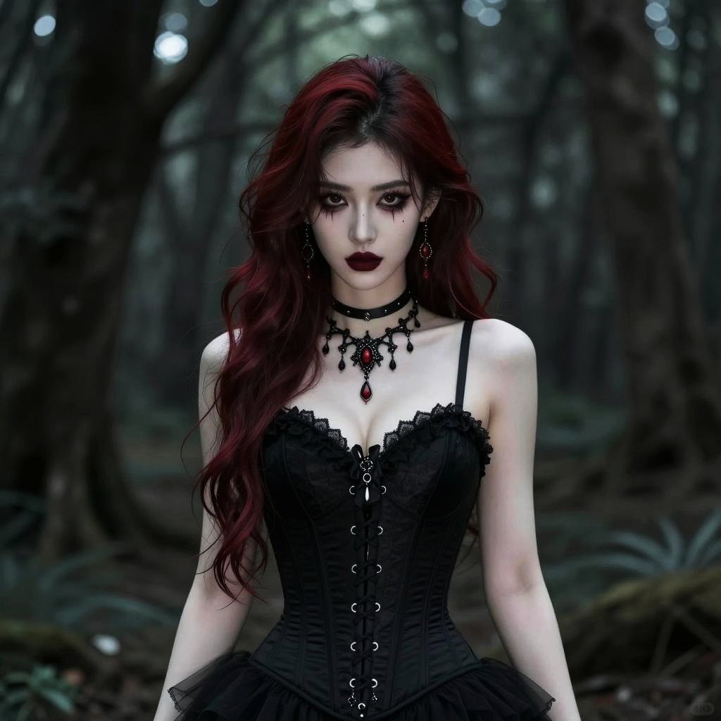 A striking woman with deep red hair and bold, dark makeup stands in an eerie forest. She wears a gothic-style black corset dress adorned with intricate lace and matching statement jewelry, embodying a modern goth or dark fantasy aesthetic.