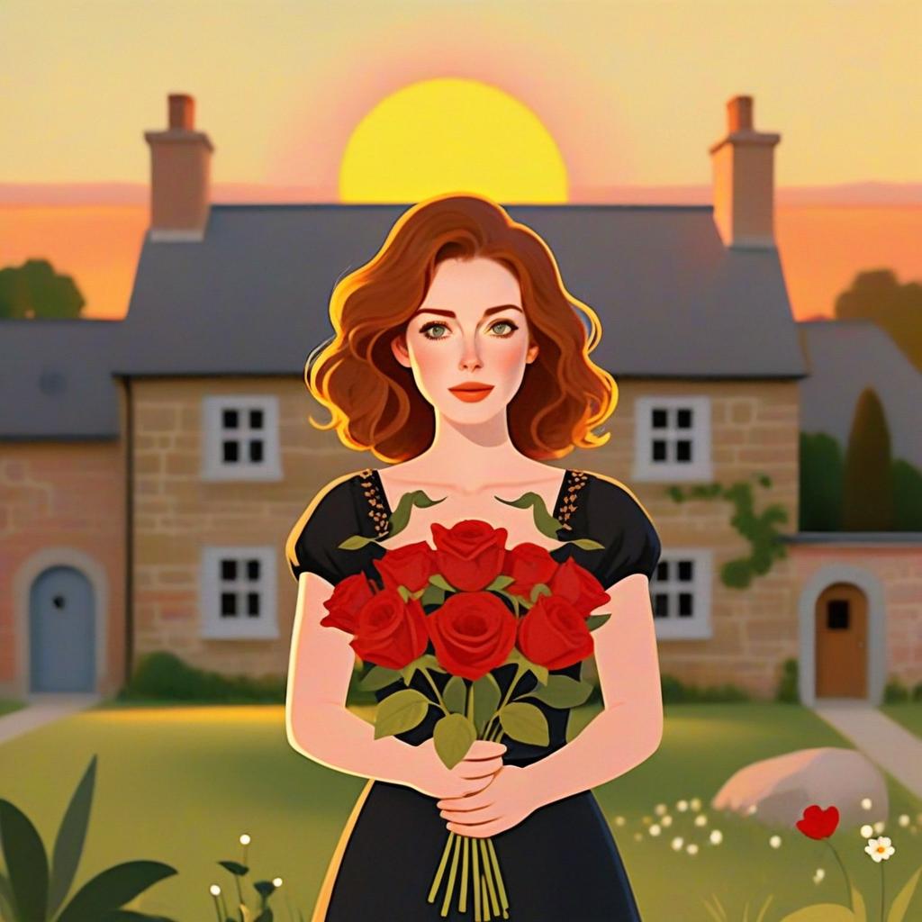 A digitally illustrated woman with flowing auburn hair stands in front of a charming countryside house at sunset, holding a bouquet of vibrant red roses. The image showcases a warm, vintage-inspired style with soft lighting and a serene pastoral background.