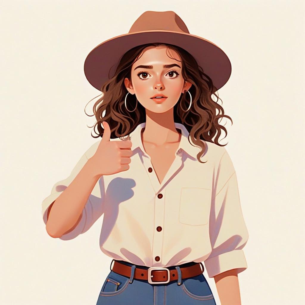 This digital illustration features a confident young woman with curly hair, wearing a stylish wide-brimmed hat and hoop earrings. She is dressed casually in a button-up shirt and jeans, giving a thumbs-up gesture with a warm and engaging expression. The image embodies a modern and trendy style with clean lines and soft shading, capturing the essence of youthful positivity.