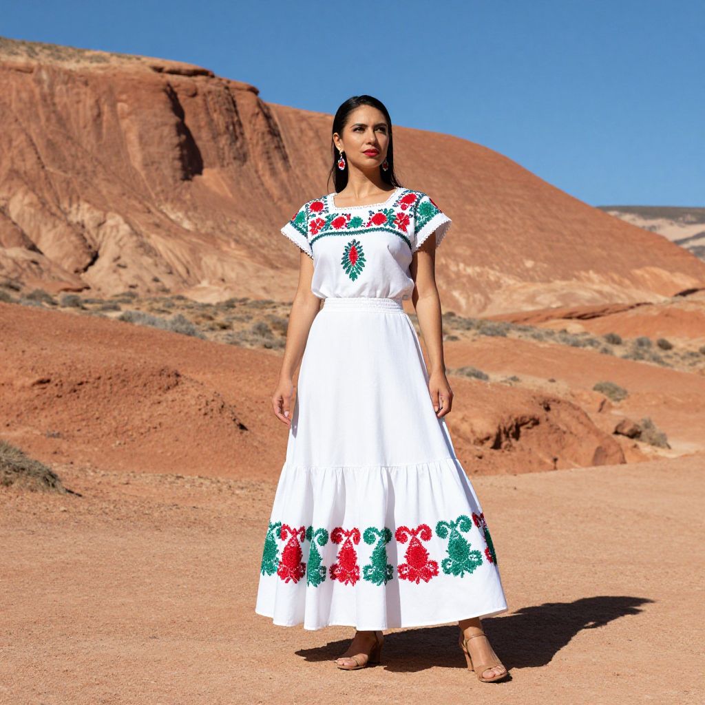 A woman stands confidently in a desert landscape wearing a traditional white dress adorned with vibrant red and green floral embroidery. The outfit features a square neckline and a flowing skirt, highlighting Mexican or indigenous embroidery styles against the earthy tones of the rocky background under a clear blue sky.