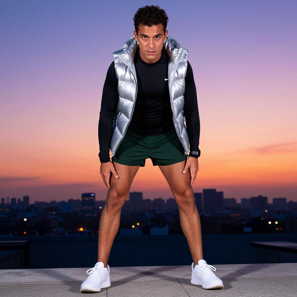 A young man is seen taking a break during an outdoor workout at sunset, wearing a silver puffer vest over a black long-sleeve shirt and green shorts. The urban skyline and colorful evening sky create a dynamic and inspiring backdrop emphasizing fitness and determination.