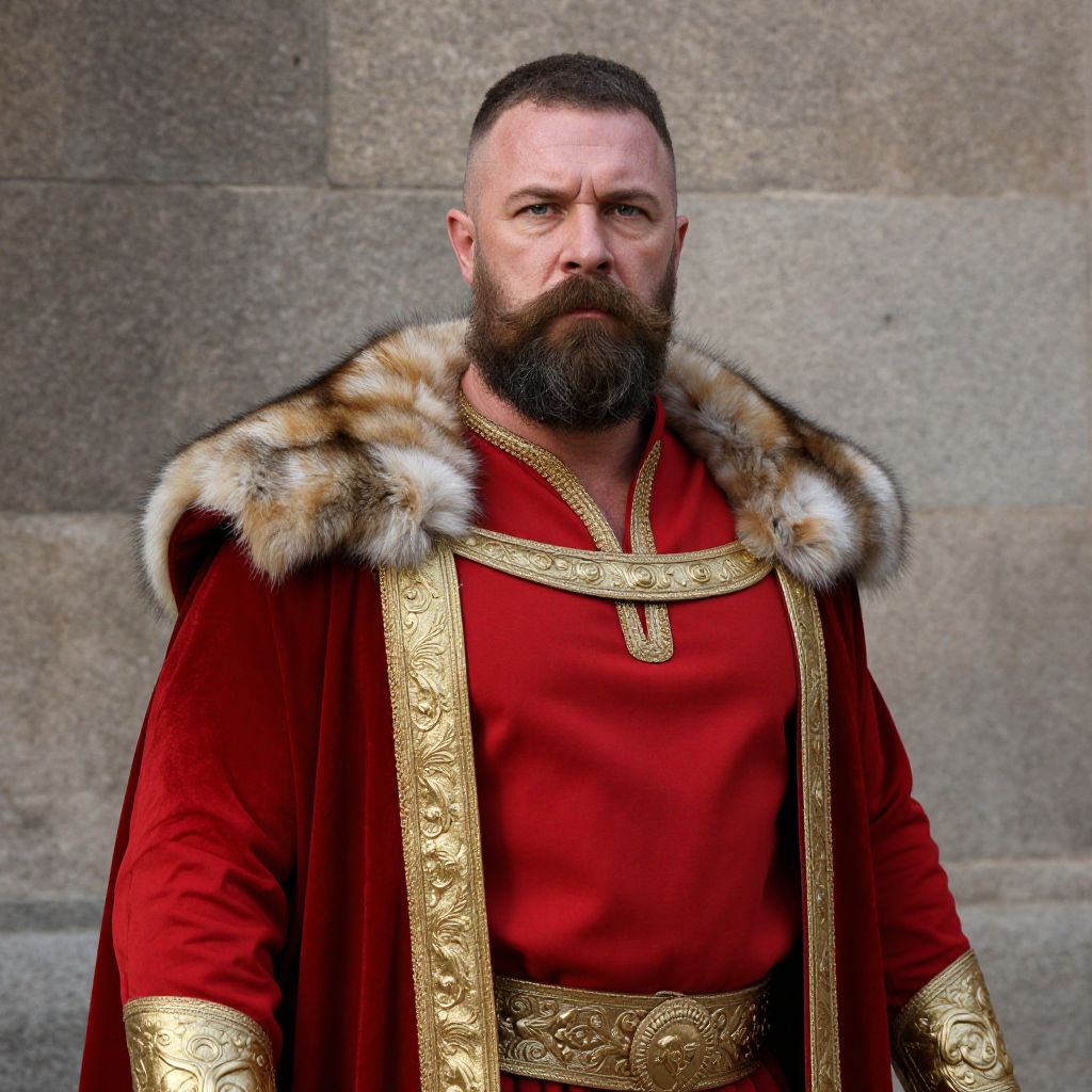 A stern man dressed in an ornate medieval-style red robe adorned with gold embroidery and fur trimming stands against a stone wall background. His strong beard and intense gaze complement the regal and historical atmosphere of the portrait.