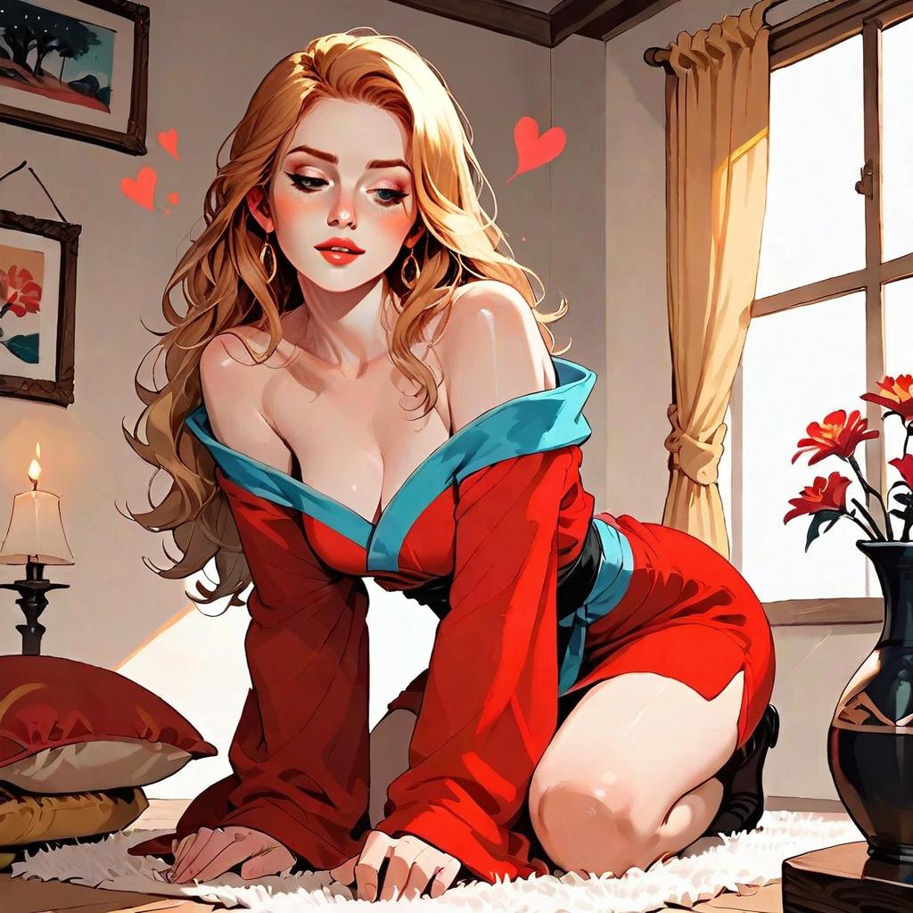 A digitally illustrated woman with long blonde hair kneels on a plush white rug in a warmly lit room, wearing a striking red dress with a blue trim. The scene is styled with romantic and cozy elements, including a softly glowing lamp, framed art on the walls, and red flowers in a vase near a sunlit window. The artwork showcases a modern, semi-realistic anime-inspired style with vibrant colors and smooth shading.