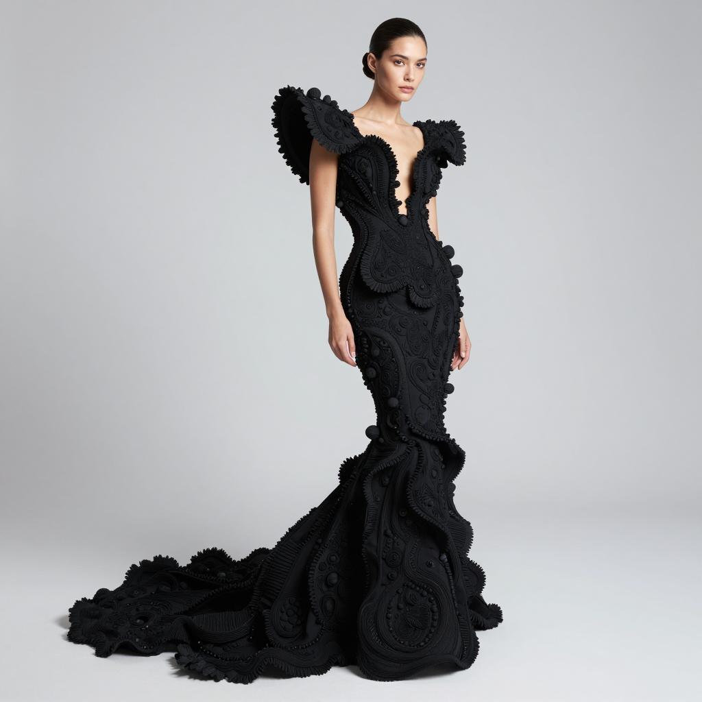 A woman models a striking, intricately detailed black evening gown with a dramatic silhouette and textured embellishments. The dress features bold sculptural shoulders and a plunging neckline, accentuating a modern couture style with artistic flair.
