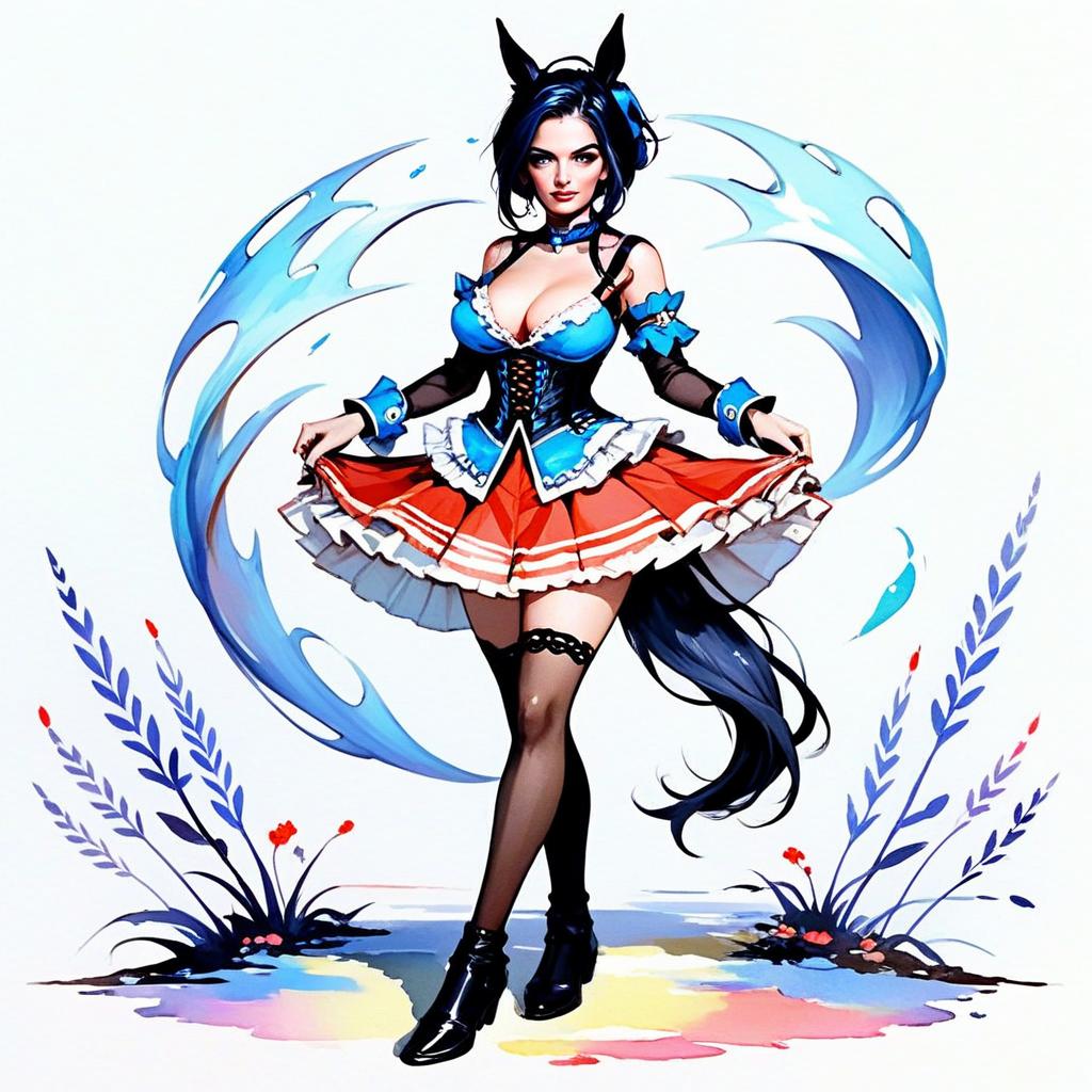 A detailed digital artwork featuring a confident woman dressed in a vibrant, fantasy-inspired outfit with cat ears and a short red and blue skirt. She is surrounded by dynamic swirling water elements and stylized plant motifs, blending a playful and magical atmosphere with modern anime-style aesthetics.