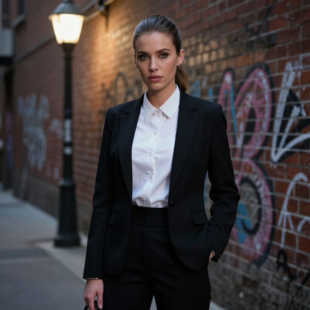 A confident woman dressed in a stylish black suit and white shirt stands against a graffiti-covered brick wall in an urban setting at dusk, illuminated softly by a nearby street lamp. The image exudes a professional and modern vibe with an edgy city background and natural lighting.