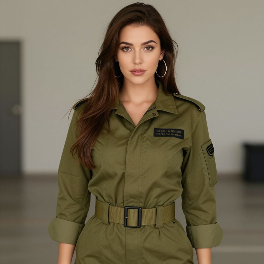 A confident woman poses wearing an olive green military-style jumpsuit with rolled-up sleeves and a wide belt at the waist. Her long brown hair is styled loosely, and she accessorizes with large hoop earrings, set against a soft, neutral background.