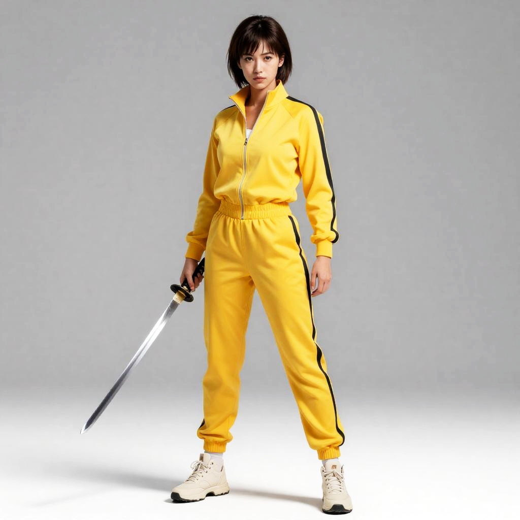 A confident woman stands poised in a bright yellow tracksuit with black stripes, holding a katana sword in her right hand. The outfit and weapon combination evokes a strong, action-inspired aesthetic reminiscent of martial arts or iconic film characters.
