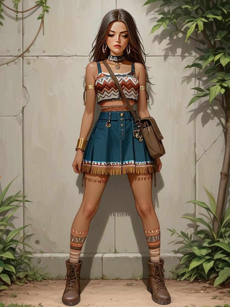 A realistic full-body portrait of a young woman dressed in a stylish bohemian patterned tank top and a high-waisted skirt with fringe detail. She accessorizes with gold armbands, a choker, hoop earrings, and lace-up boots, standing confidently against a stone wall backdrop surrounded by greenery.