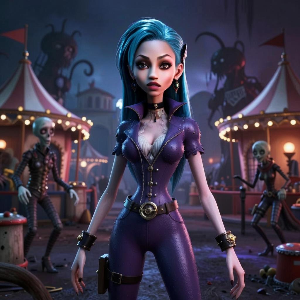 A striking animated woman with vibrant blue hair and a fitted purple leather outfit stands confidently in a dark, eerie carnival setting. The scene features a gothic and slightly steampunk style, with skeletal characters and ominous carnival tents in the background, creating a mysterious and fantastical atmosphere.