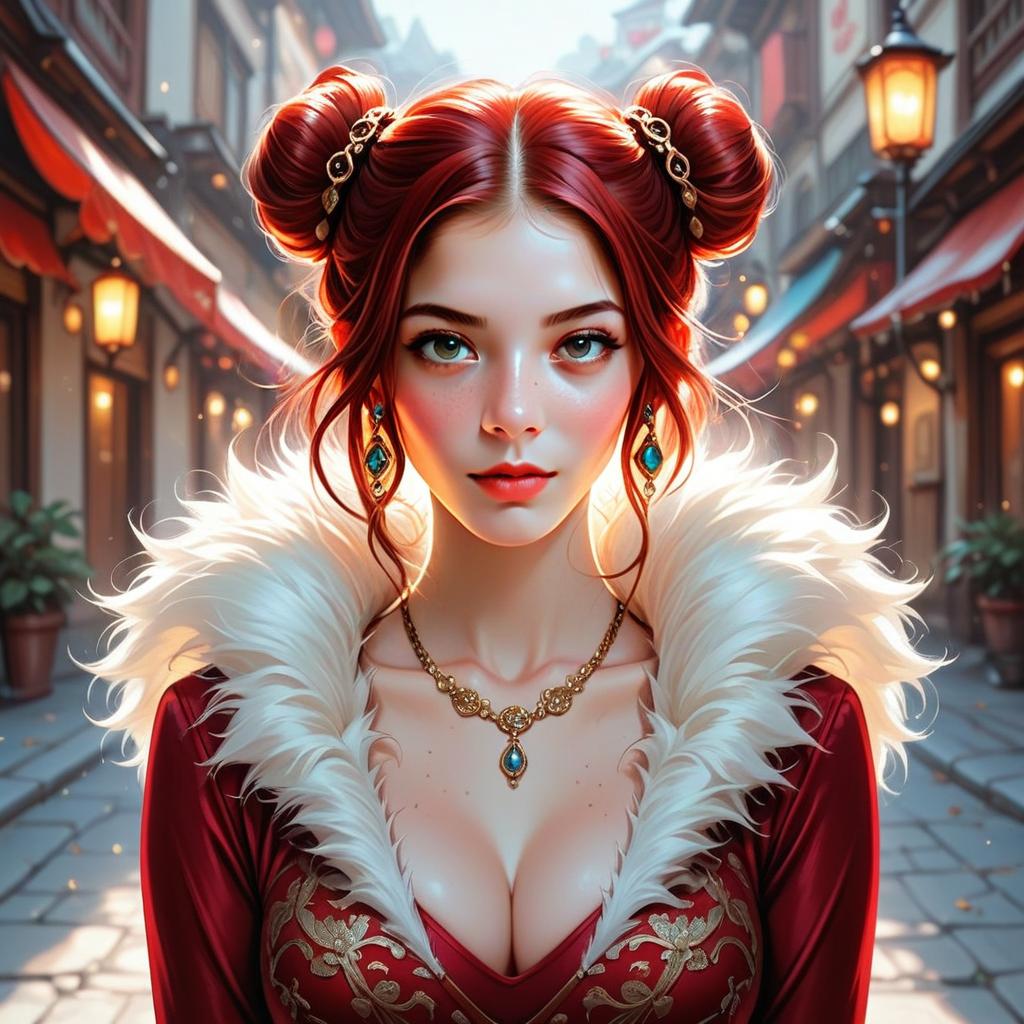 A striking digital illustration of a red-haired woman in an intricate red and gold garment with a fluffy white collar, set against a softly blurred, warmly lit street background. The detailed anime-style artwork features elegant jewelry, including turquoise earrings and a matching necklace, highlighting a regal and fantasy-inspired atmosphere.