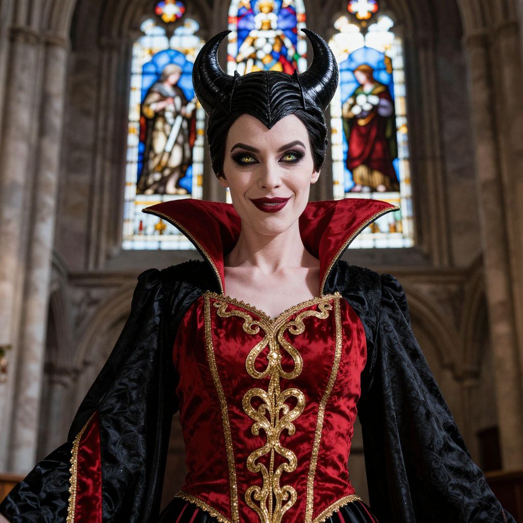 A woman dressed as a dark sorceress stands confidently in a gothic cathedral, wearing a detailed black and red velvet costume adorned with gold embroidery. Her striking horned headpiece, dramatic makeup, and piercing yellow eyes contribute to her powerful and mystical appearance, set against the backdrop of colorful stained glass windows.