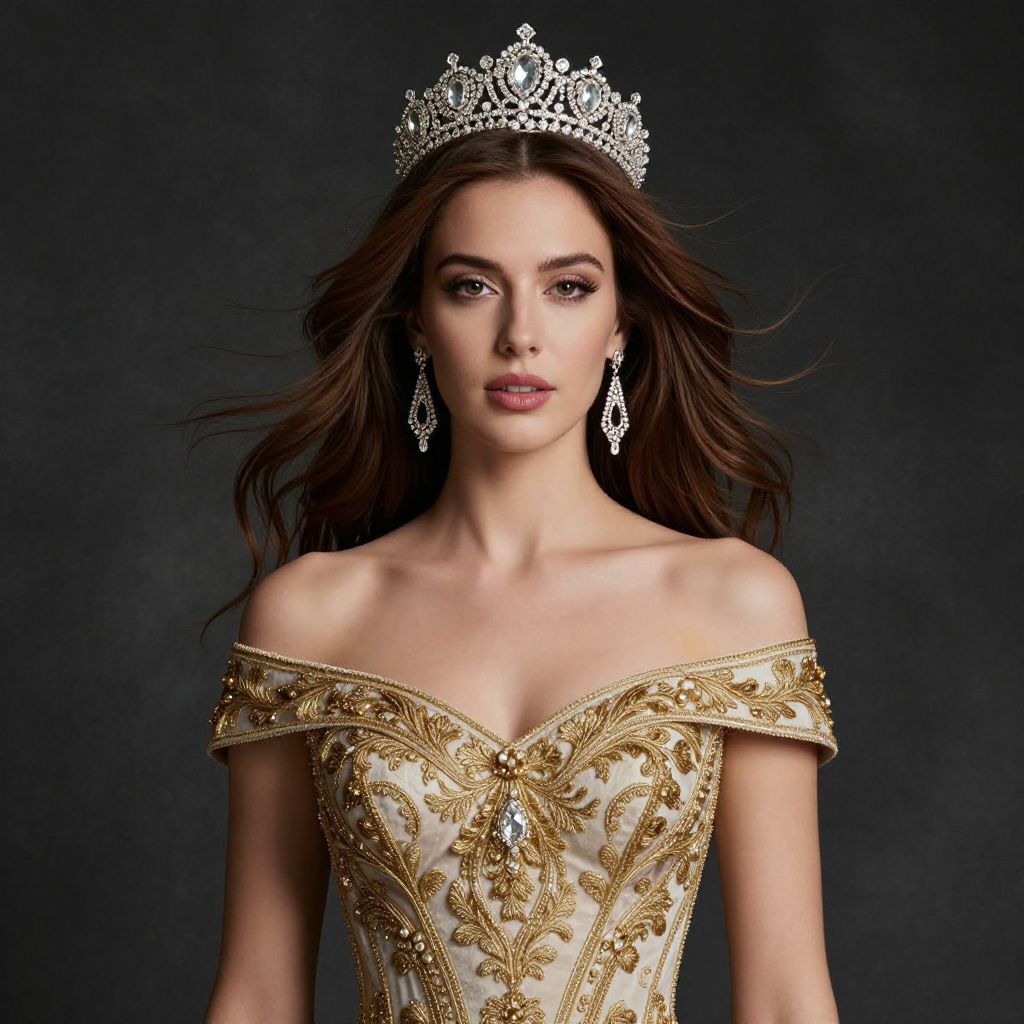 A regal young woman poses elegantly against a dark background, wearing a luxurious off-shoulder gown richly embroidered with gold details and adorned with pearl accents. She is crowned with a sparkling jeweled tiara and matching chandelier earrings, embodying a classic beauty queen or royal style portrait.