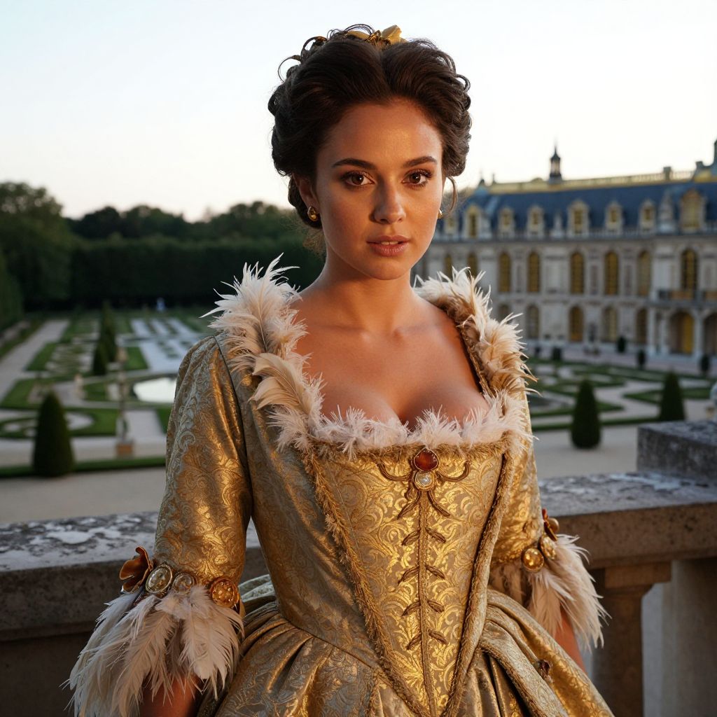 A woman dressed in an ornate gold 18th-century style gown with intricate embroidery and feather detailing stands on a stone balcony, overlooking a formal French garden. The historic setting and her elegant attire evoke the grandeur of the Baroque period in a warm evening light.