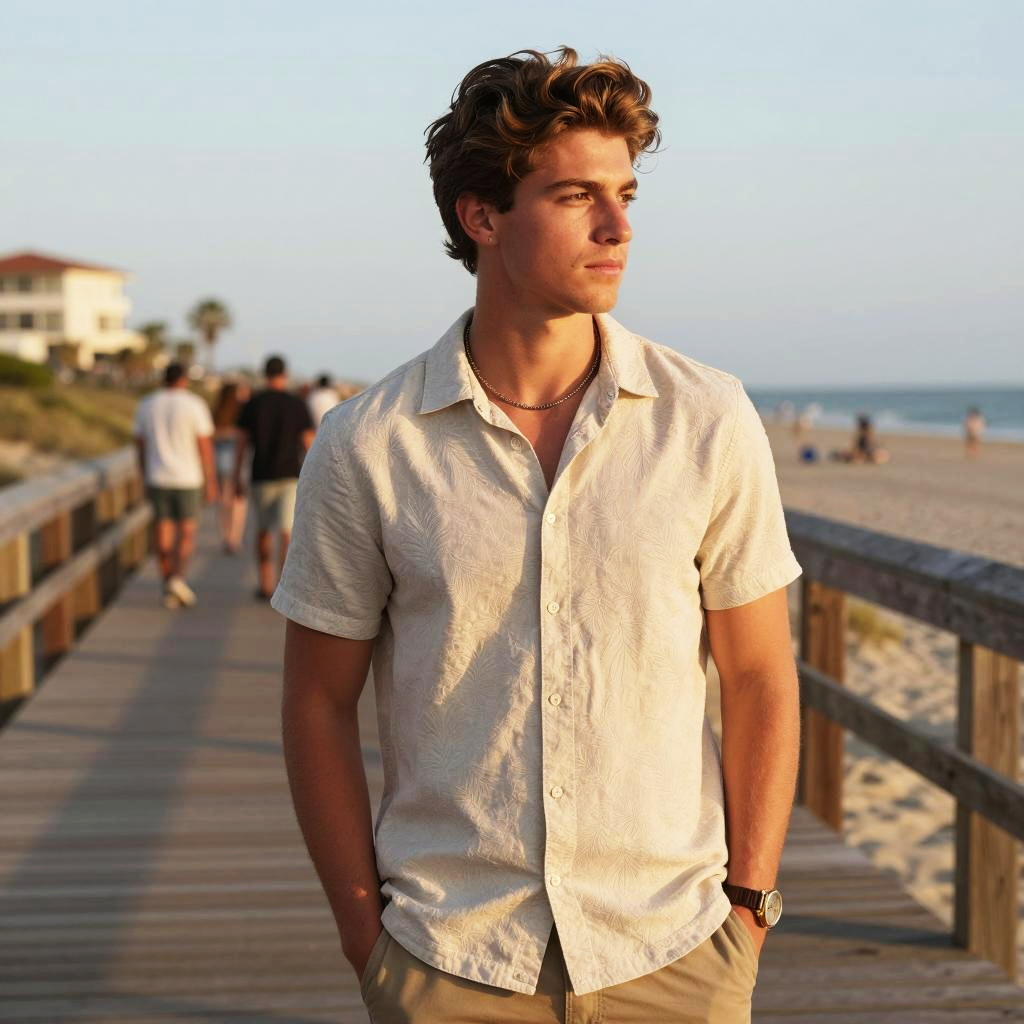 A young man stands on a wooden boardwalk near the beach during golden hour, gazing thoughtfully into the distance. His casual, short-sleeved shirt and relaxed posture reflect a laid-back, summertime vibe typical of Gen Z fashion.