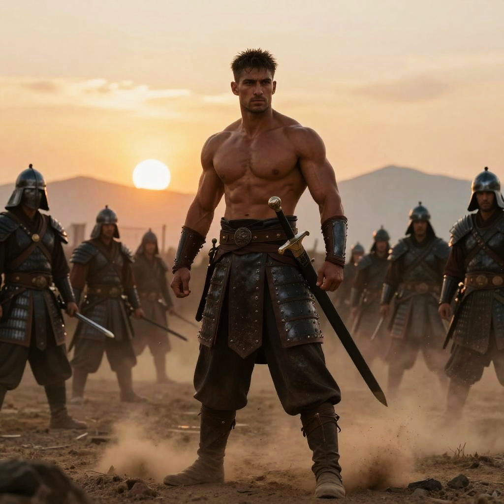 A muscular man dressed as a warrior stands confidently in the foreground during sunset, surrounded by a group of armored soldiers. The image captures a dramatic and intense scene with historical or fantasy battle elements, highlighted by the warm, golden light and dust-filled atmosphere.