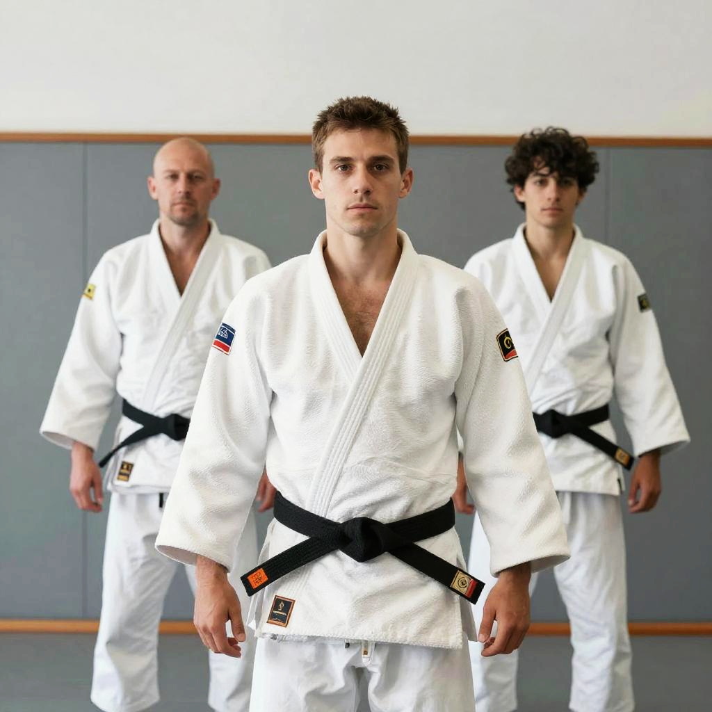 Three men wearing white judo kimonos with black belts stand in a dojo in front of a grey padded wall. The image captures the discipline and focus typical of judo practitioners, highlighting the traditional martial art attire and setting.