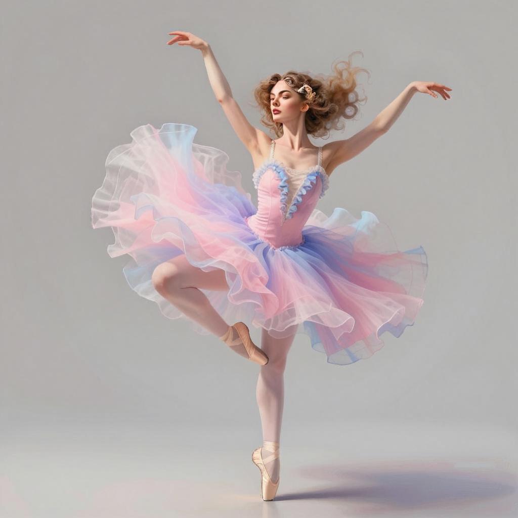 A graceful woman ballet dancer poses elegantly en pointe, showcasing flawless technique and poise. She wears a flowing pastel pink and blue tutu that creates a soft, ethereal effect as it flares around her. The image captures the fluidity and beauty of classical ballet in a clean, minimalist studio setting.