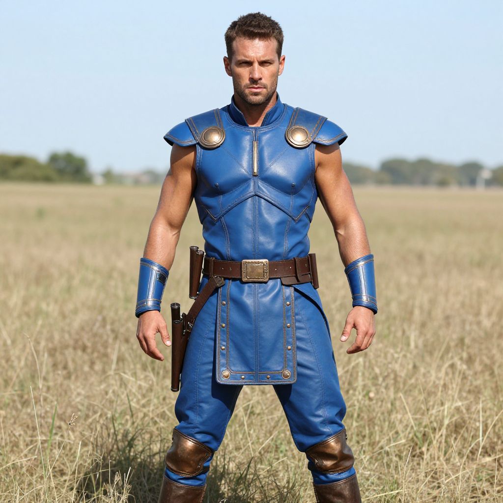 A man dressed in a detailed blue leather gladiator-style costume stands confidently in an open field under a clear sky. The outfit features metallic bronze accents on the shoulders, wrist guards, and knee pads, with a wide belt and attached holsters enhancing the strong warrior appearance.