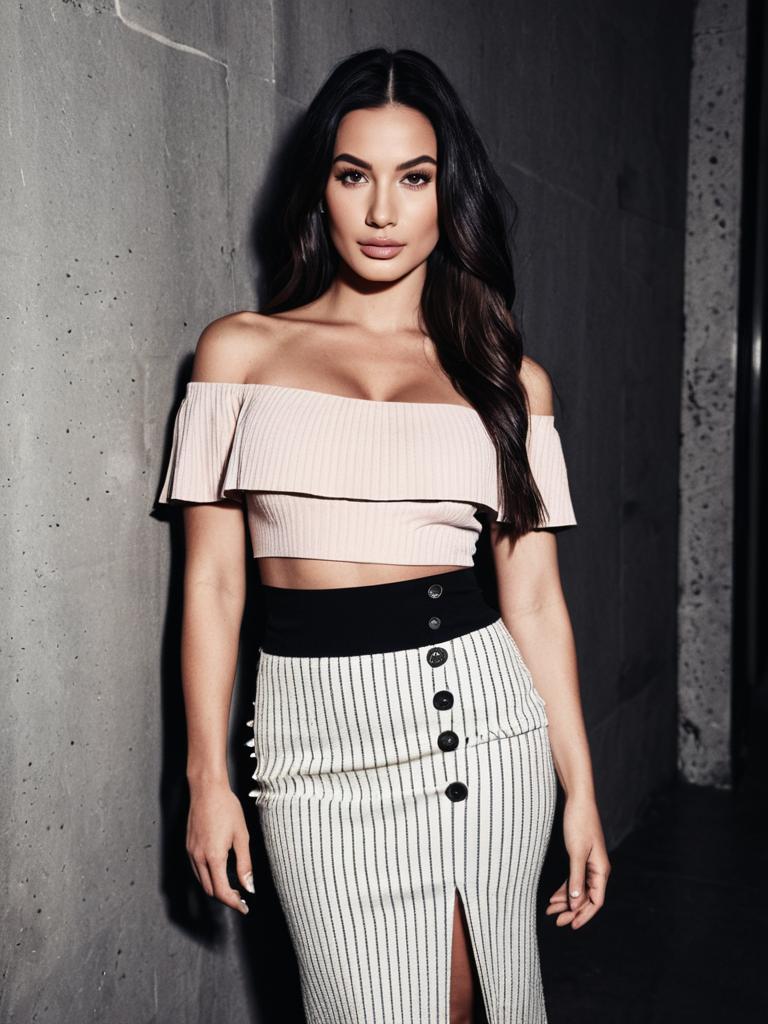 A stylish woman poses confidently against a concrete wall, wearing a chic off-shoulder ribbed crop top paired with a high-waisted, vertically striped skirt featuring button details and a front slit. The contemporary fashion look is highlighted by her sleek long hair and well-defined makeup, set in a modern, urban environment.