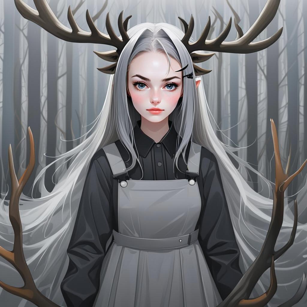 This digital artwork features a young woman with striking silver hair and large, majestic antlers in a misty forest setting. Rendered in a detailed anime style, the composition highlights her serene yet enigmatic expression, blending fantasy elements with high-quality character design.