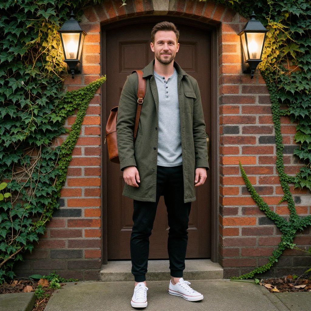 A stylish man stands confidently in front of a rustic brick doorway framed by green ivy and warm lantern lights. Dressed in a casual modern outfit with an olive green coat, grey henley shirt, black pants, and white sneakers, he carries a brown leather backpack, blending a relaxed yet fashionable look.