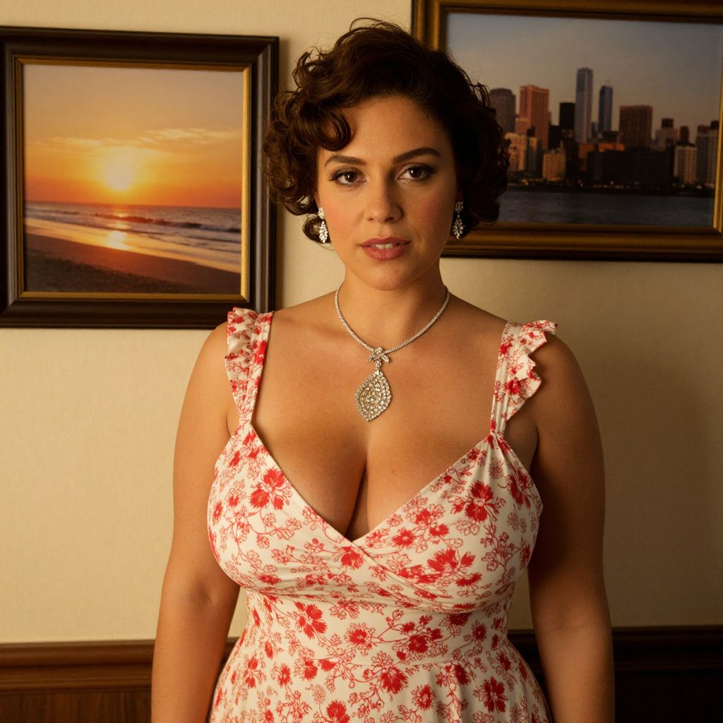 A woman with short curly hair wearing a white dress adorned with red floral patterns stands confidently indoors, accentuated by elegant diamond jewelry including a necklace and earrings. Behind her, framed photos of a sunset beach and a city skyline add a warm and sophisticated ambiance to the setting.