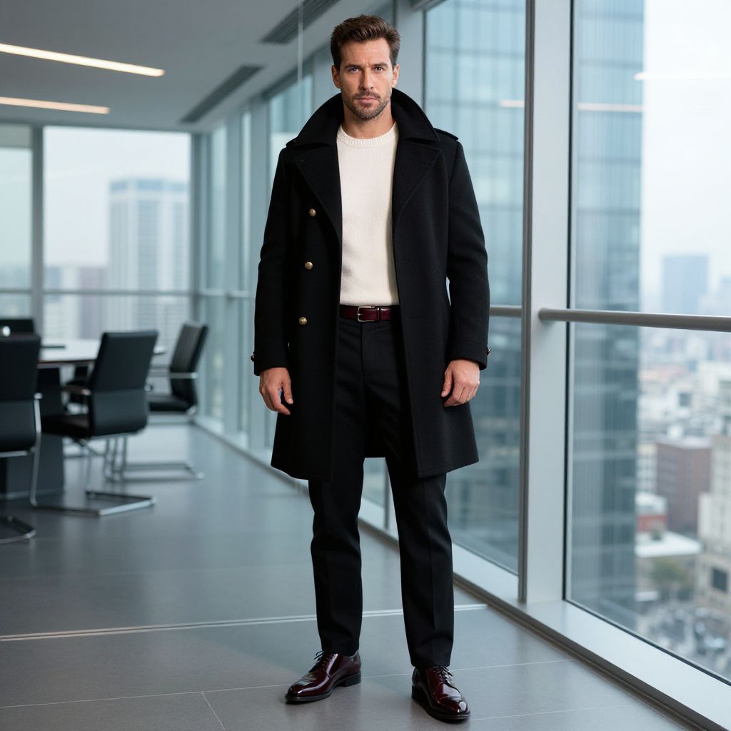 A confident man stands in a modern office space with floor-to-ceiling windows overlooking a cityscape. He is dressed in a stylish black overcoat paired with a white sweater, black trousers, and polished dress shoes, embodying a sophisticated and professional look.