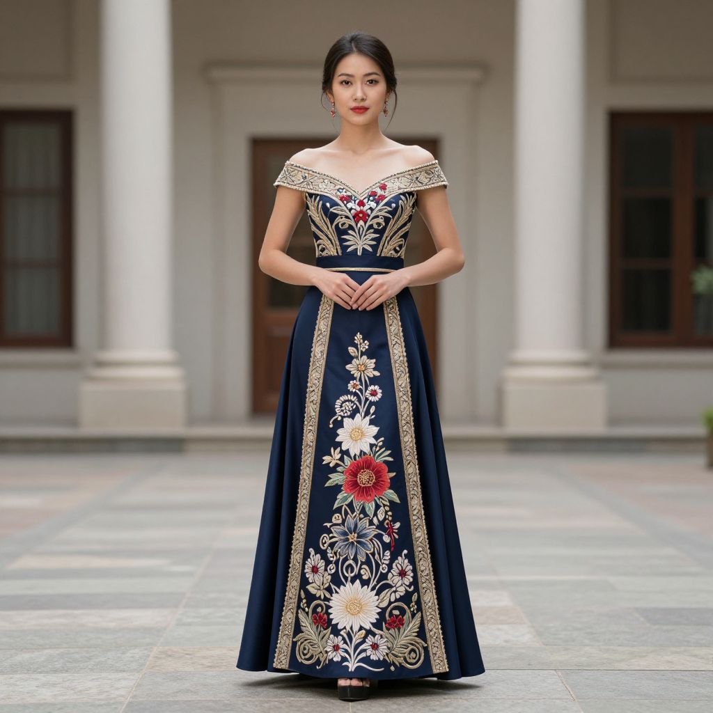 A woman stands gracefully in an elegant off-shoulder navy blue gown featuring intricate floral embroidery with gold accents. The detailed design and poised posture highlight the sophistication and cultural richness of the attire.