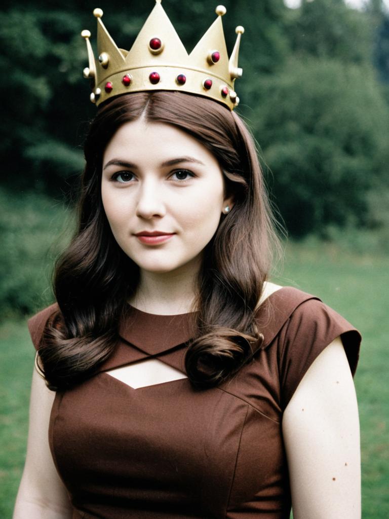Woman Wearing Princess Hilda Costume with Crown and Brown Dress Outdoors