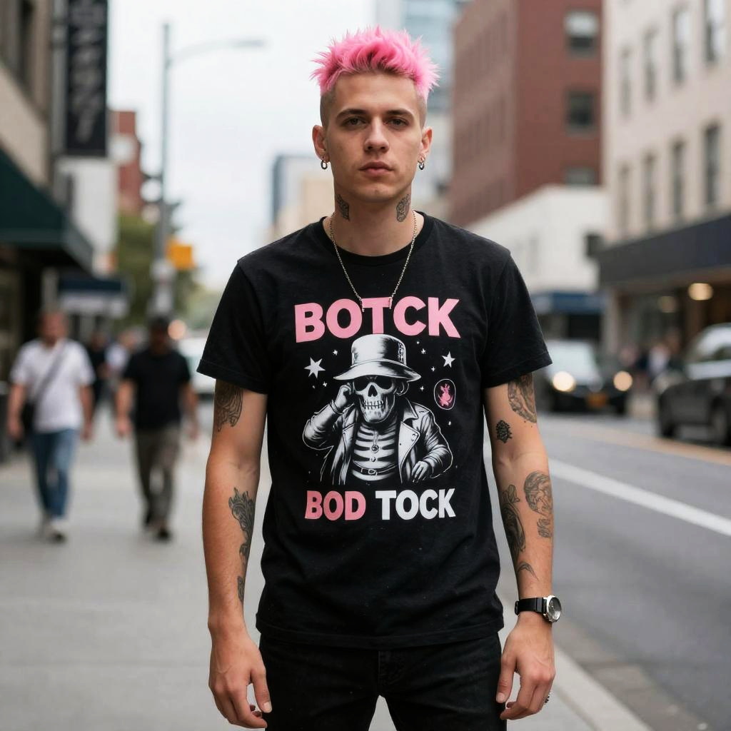 A man with vibrant pink hair and tattoos stands confidently on a city street, wearing a black punk rock style T-shirt featuring a skeleton in a hat and the text 'BOTCK BOD TOCK' in pink and white. The urban background is slightly blurred, emphasizing the edgy, rebellious vibe of his fashion and overall look.