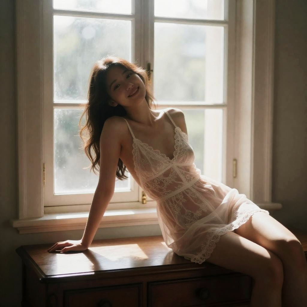 A young woman wearing delicate lace lingerie sits on a wooden chest by a sunlit window, her relaxed pose and gentle smile creating a soft, intimate atmosphere. The warm natural light accentuates the sheer fabric and intricate details of her outfit, highlighting the elegant and feminine style.