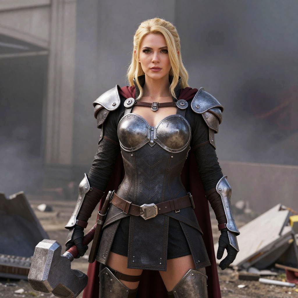 A determined woman stands confidently in a battle-worn environment, dressed in medieval-style armor with a metallic breastplate, gauntlets, and a crimson cape. She holds a large hammer, embodying strength and resilience in a fantasy warrior aesthetic.