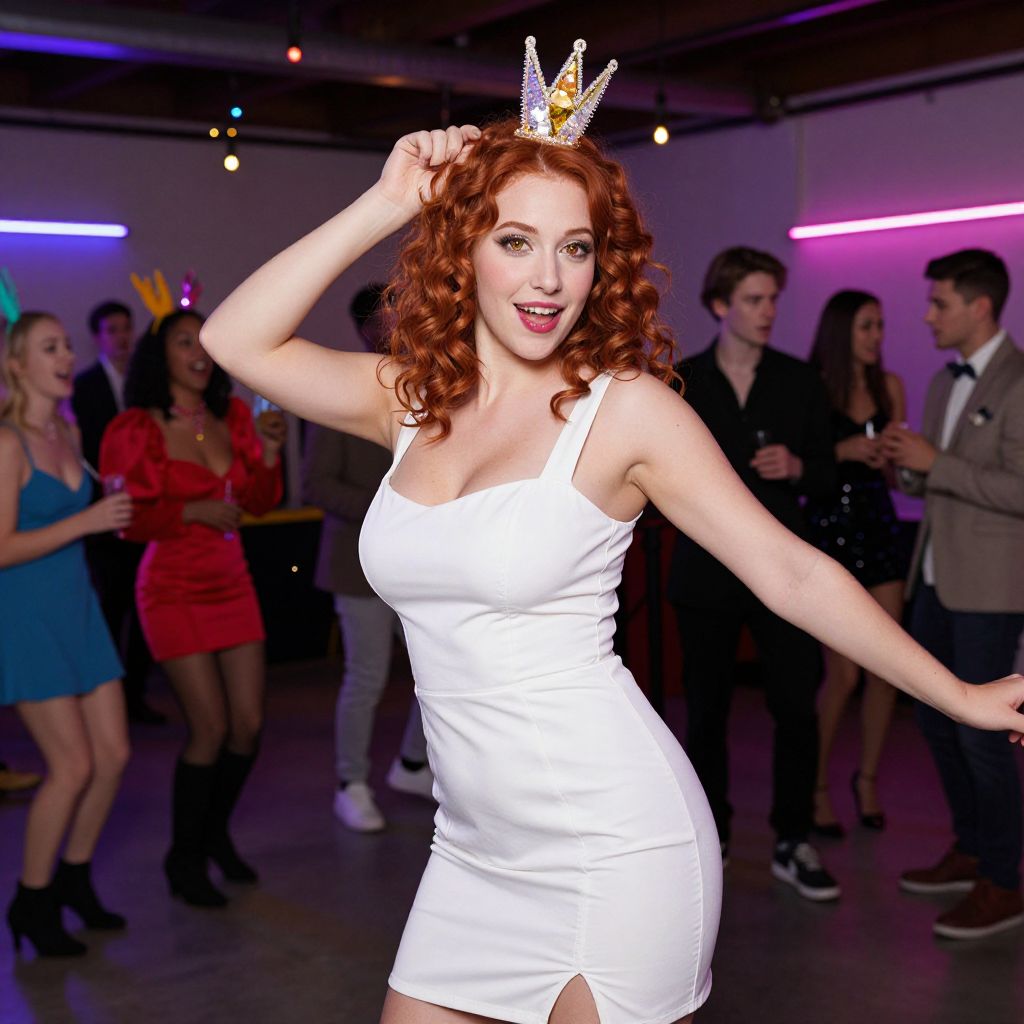 A red-haired woman in a white dress and a tiara is joyfully dancing at a lively party. The background features a group of people socializing and enjoying the vibrant atmosphere under colorful neon lights.