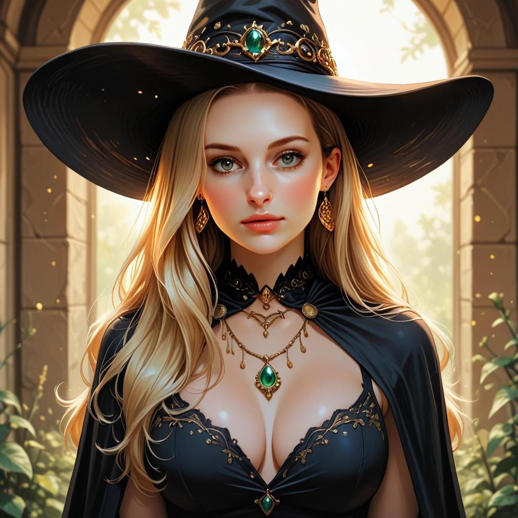 A striking portrait of a woman dressed as an elegant sorceress, featuring a wide-brimmed hat with intricate gold details and gemstone-adorned armor. The fantasy-themed digital artwork showcases her poised expression and glowing lantern-lit city street in the background, rendered in a highly detailed, realistic style.
