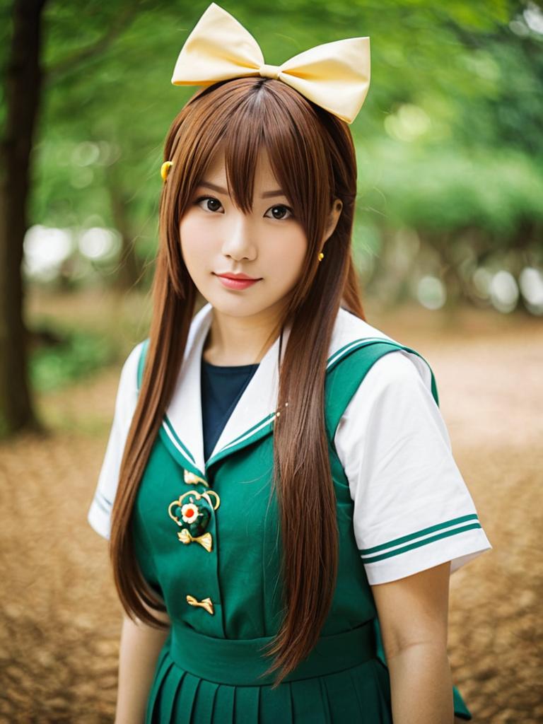 A young woman dressed as Arima Miyako from a popular anime stands outdoors with soft natural lighting, surrounded by blurred greenery. She is wearing a green sailor-style school uniform with a large yellow bow on her head, capturing the character's distinct look in a realistic cosplay style.