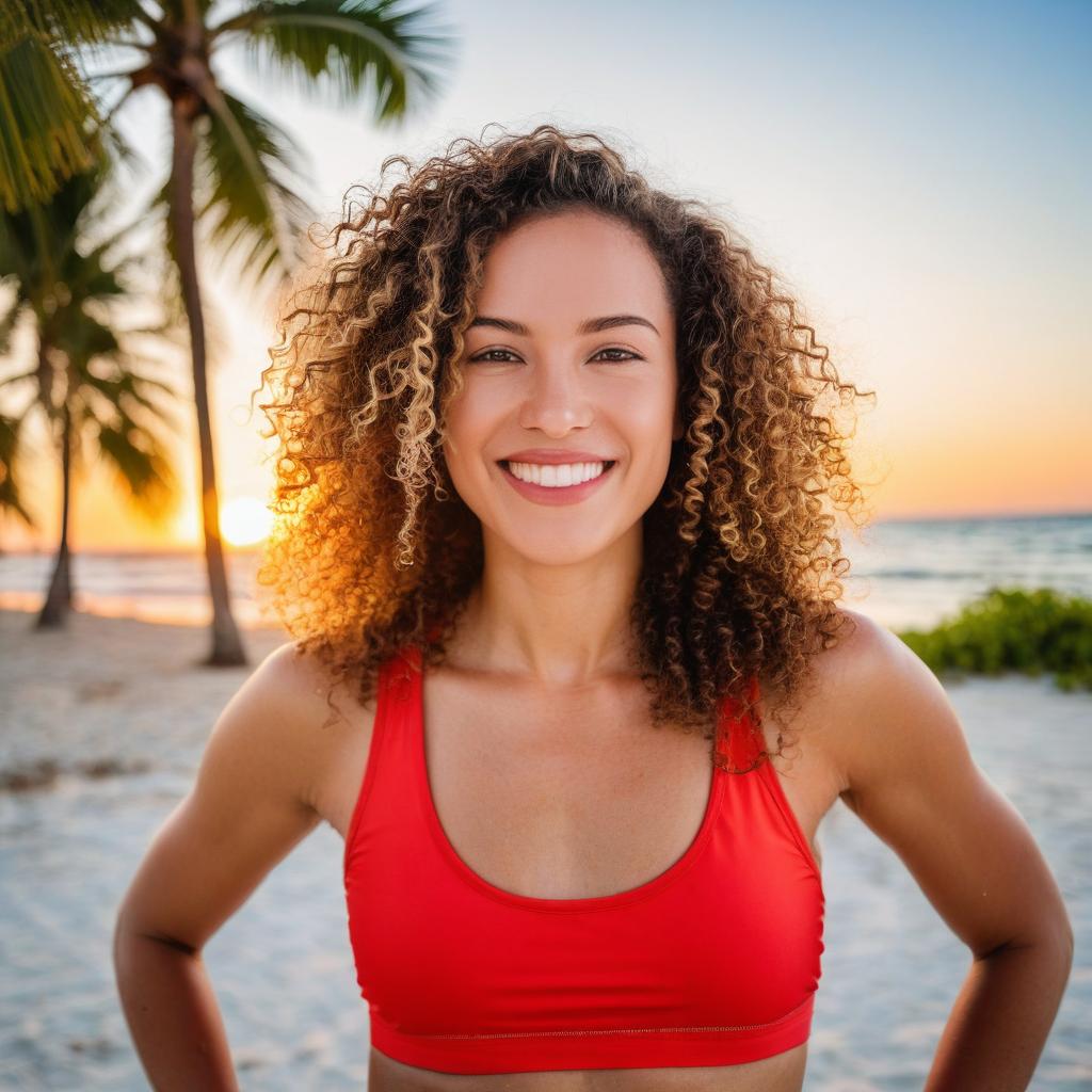A smiling woman with curly hair stands confidently on a beach at sunset, wearing a bright red sports top. The warm sunlight highlights her features against a backdrop of palm trees and a calm ocean, capturing a vibrant and natural outdoor moment.