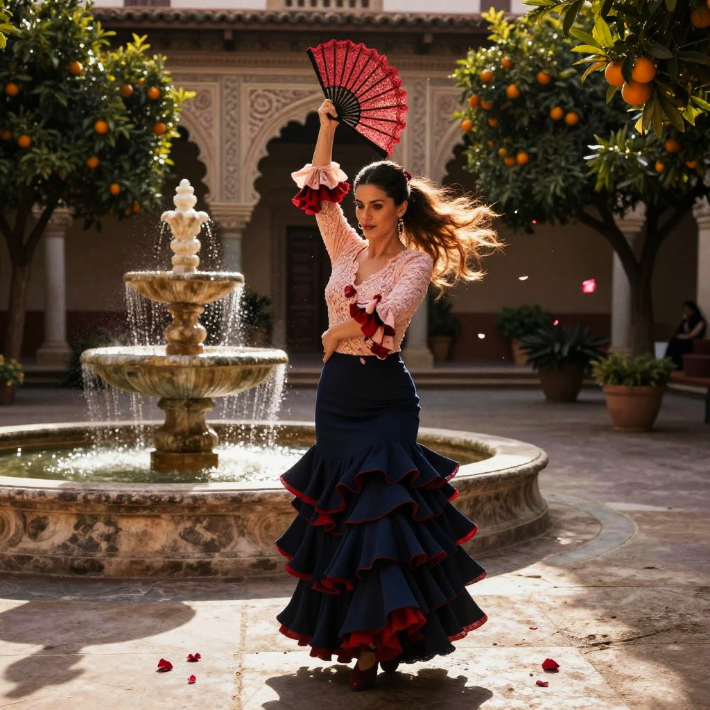 A woman dressed in a traditional flamenco outfit dances gracefully in a sunlit courtyard adorned with orange trees and a stone fountain. She holds a red fan above her head, complementing her ruffled navy and red skirt and pink top, capturing the passionate spirit of flamenco dance.