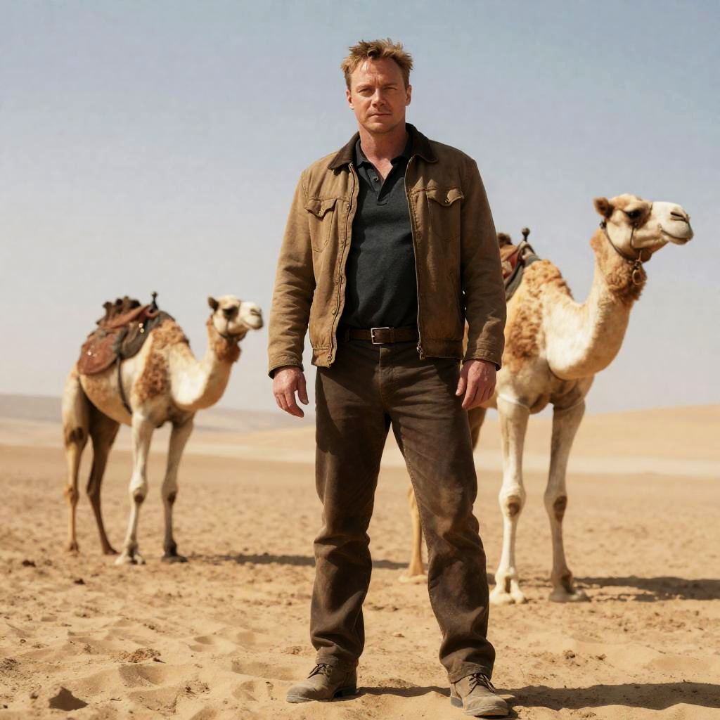 A man stands confidently in a vast desert landscape with two camels nearby, each adorned with saddles. The scene captures a rugged and adventurous atmosphere reminiscent of classic desert exploration and cinematic adventure styles.