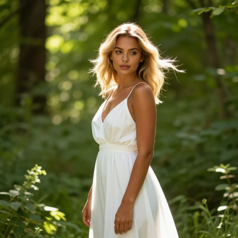 A young woman in a flowing white dress stands gracefully in a sunlit forest, surrounded by lush greenery. The soft natural light highlights her blonde hair and serene expression, creating a peaceful and elegant outdoor portrait.
