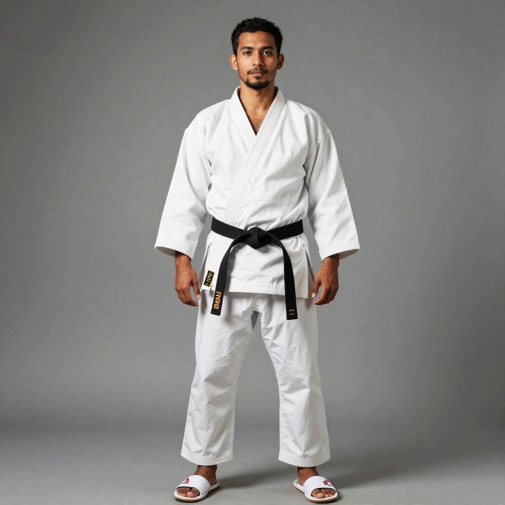 Man Wearing White Karate Gi with Black Belt Standing Against Gray Background