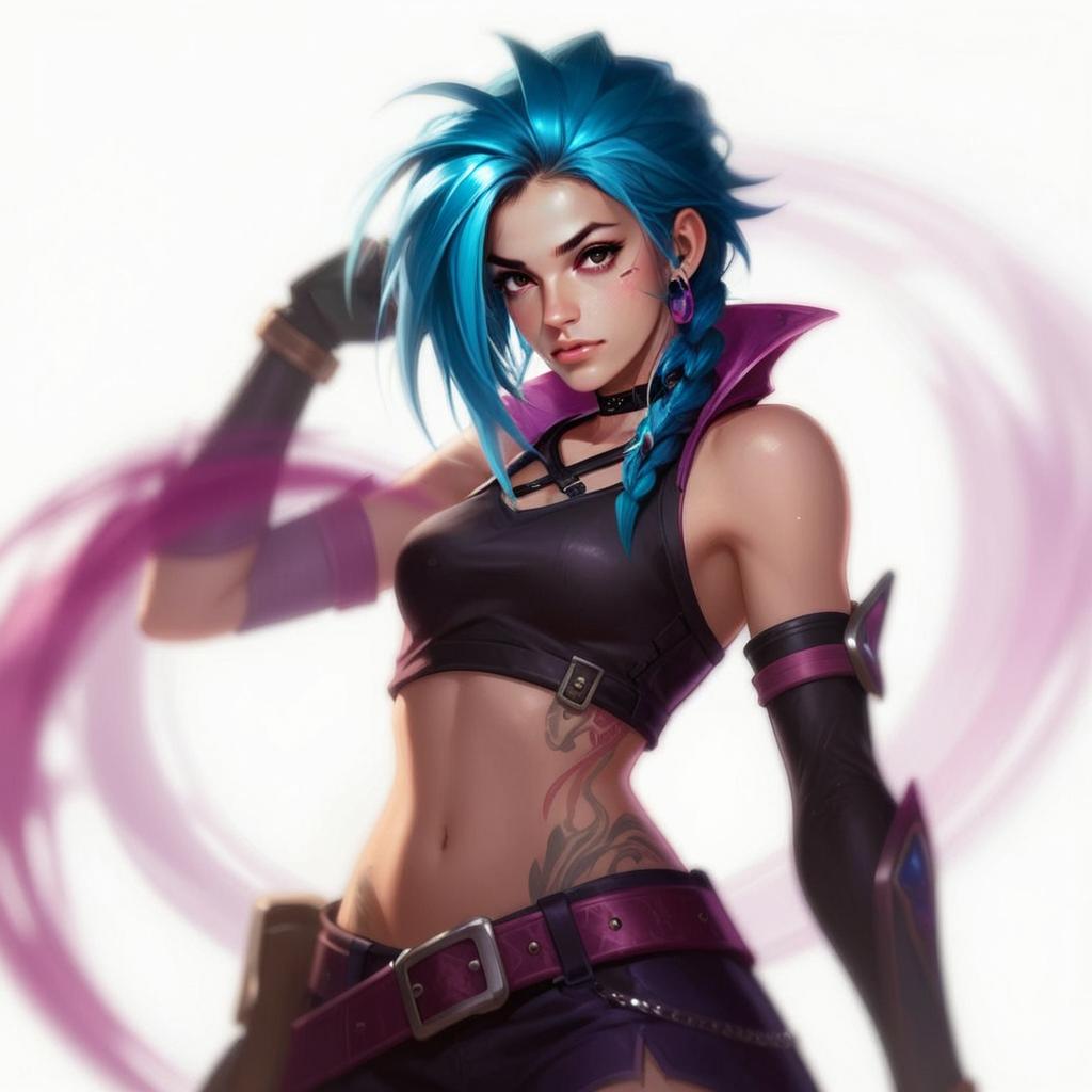 This digital artwork features a confident young woman with striking blue hair styled in a side braid, wearing a black crop top and dark arm sleeves with purple accents. The image highlights a dynamic and bold character design with a futuristic and fantasy-inspired style, accented by her tattoo and intense gaze.