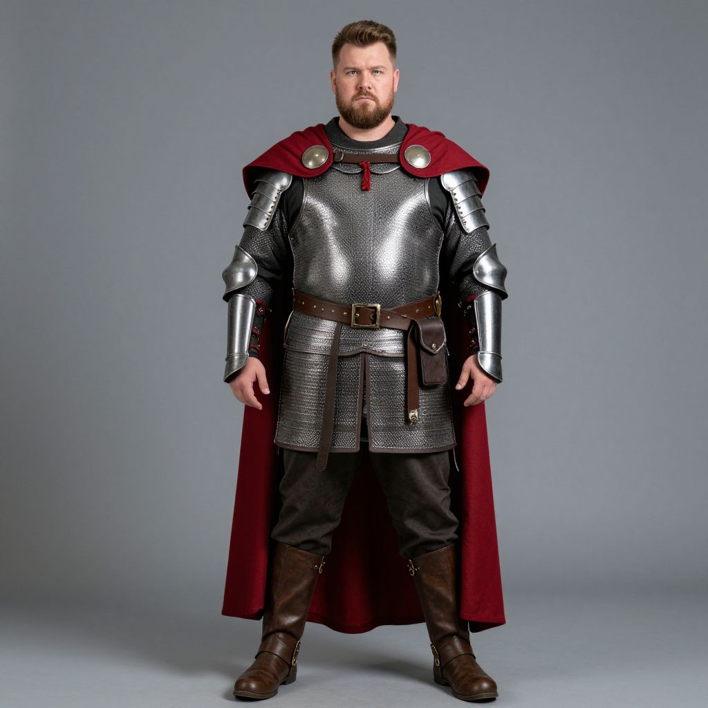 A man dressed in a detailed medieval knight costume stands confidently against a plain gray background. He wears shiny chainmail armor coupled with metallic arm guards, a leather belt, and a flowing deep red cape, evoking historical European medieval style.