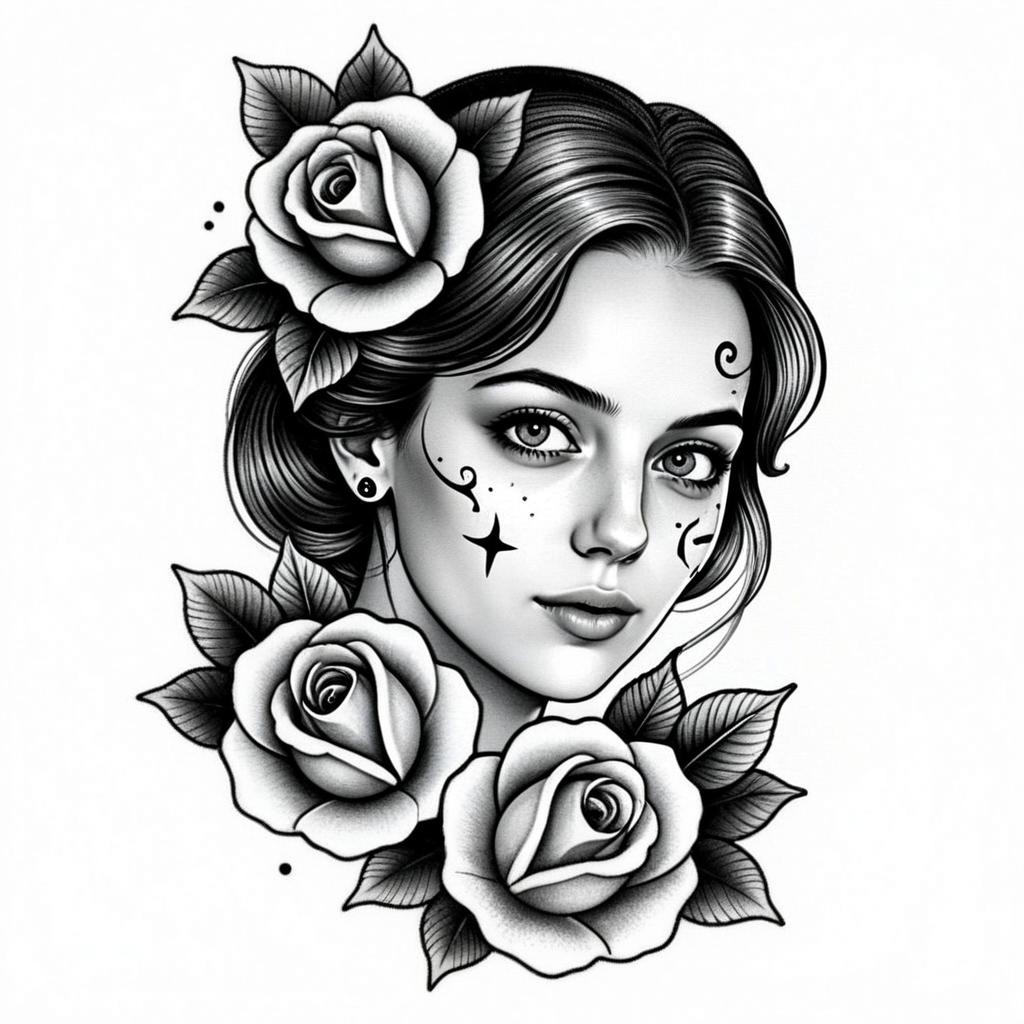 Black and White Digital Portrait of Woman with Roses and Facial Tattoo Art