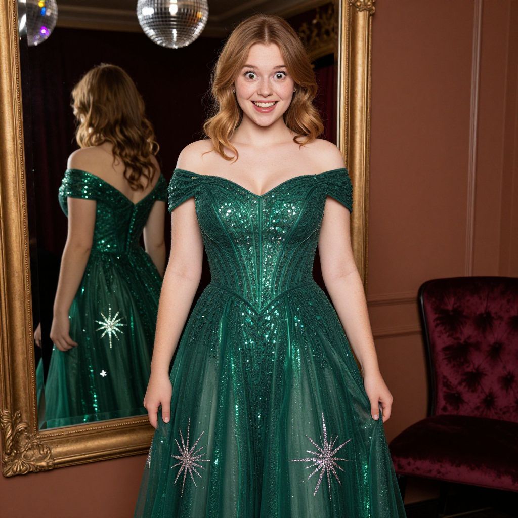 A young woman stands confidently in front of an ornate mirror, wearing an elegant off-the-shoulder emerald green gown adorned with sequins and star-like embellishments. The luxurious setting, complete with a velvet chair and a disco ball overhead, adds a glamorous and vintage-inspired atmosphere to the scene.