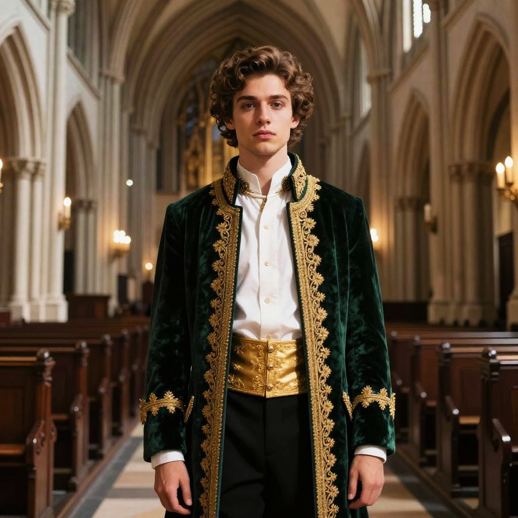 A young man stands confidently in a grand cathedral aisle, dressed in an elaborate dark green velvet jacket adorned with intricate gold embroidery and complemented by a shining gold waist sash. His attire reflects a regal, period-style fashion, set against the majestic and ornate Gothic architecture of the church interior.